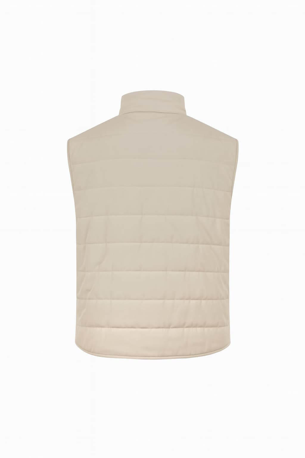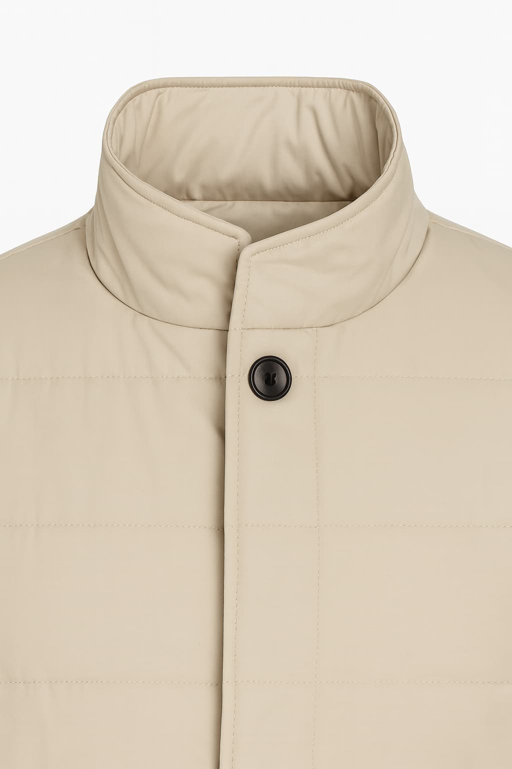Лёгкий утеплитель создаёт комфортную терморегуляцию, не утяжеляя изделие, а продуманная горизонтальная стёжка подчёркивает чистую линию дизайна. Воротник-стойка обеспечивает дополнительную защиту от ветра и смотрится выразительно в любом образе, сохраняя ощущение элегантной минималистичности. Нейтральный оттенок беж идеально сочетается как с повседневной, так и с более формальной одеждой.