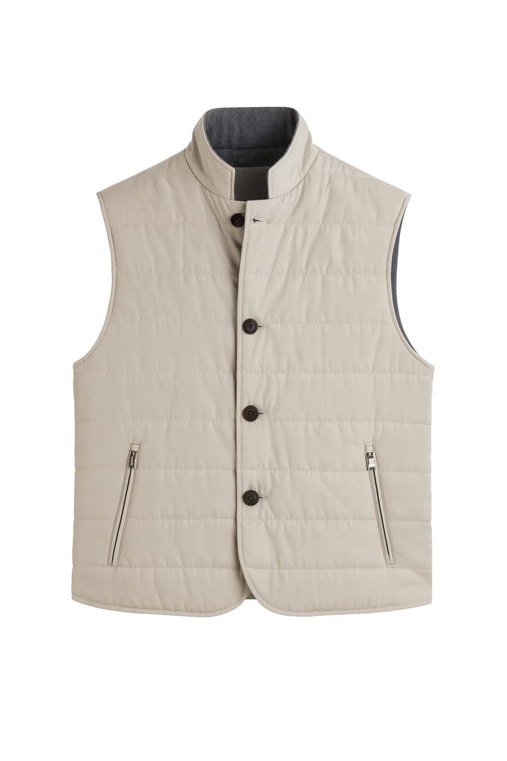 Материал верха — плотная смесовая ткань премиального качества, устойчивая к истиранию и лёгким заломам; внутри мягкая подкладка, создающая дополнительный комфорт. Утеплитель тонкий, лёгкий, равномерно распределён благодаря точной стёжке, что делает жилетку универсальной в носке в межсезонье. Фурнитура представлена лаконичными матовыми пуговицами и качественными молниями с плавным ходом. Воротник выполнен в двухслойной конструкции, аккуратно держит форму и сохраняет опрятный вид. Все швы ровные, выполнены с высокой точностью, что подчёркивает премиальное исполнение изделия.