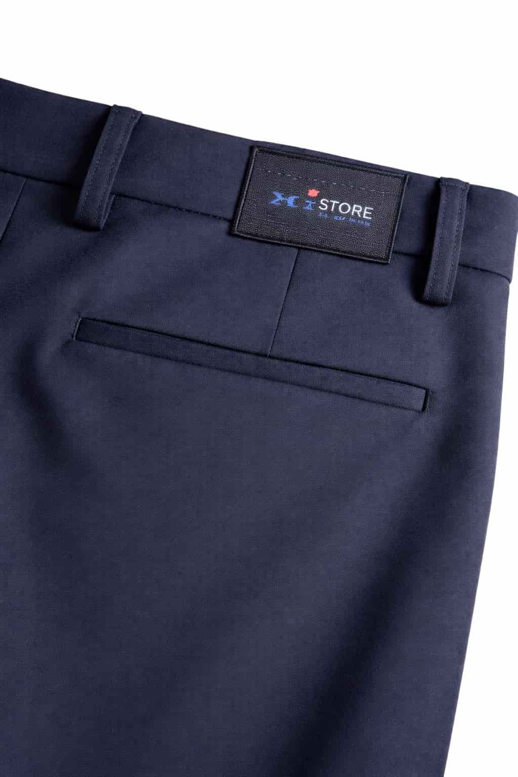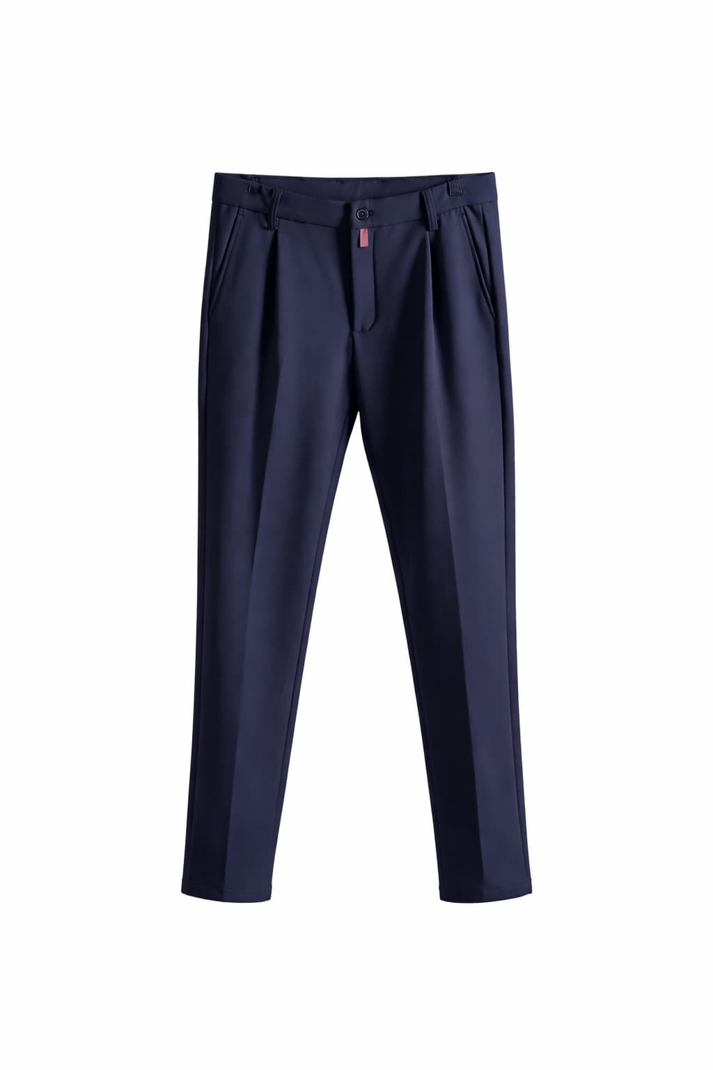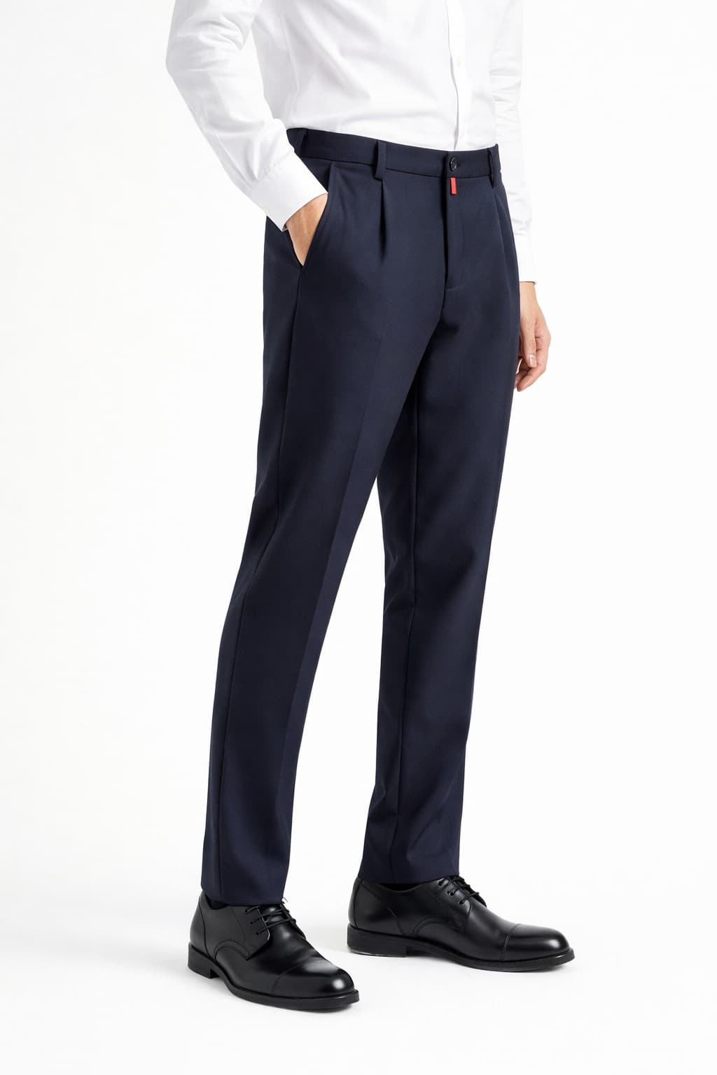 Модель выполнена из плотной, гладкой ткани с мягкой текстурой, которая хорошо держит форму и сохраняет аккуратный внешний вид даже при активной носке. Брюки имеют классическую посадку по талии, прямой крой с лёгким заужением к низу и чётко сформированную линию стрелки, визуально вытягивающую силуэт. Пояс дополнен шлёвками под ремень, застёжка выполнена на пуговице и молнии, внутренние швы аккуратно обработаны. Спереди расположены удобные боковые карманы, сзади — прорезные карманы с минималистичным дизайном. Универсальный оттенок тёмно-синего цвета легко сочетается с рубашками, пиджаками, трикотажем и обувью разных стилей, позволяя создавать как строгие, так и более расслабленные образы.
