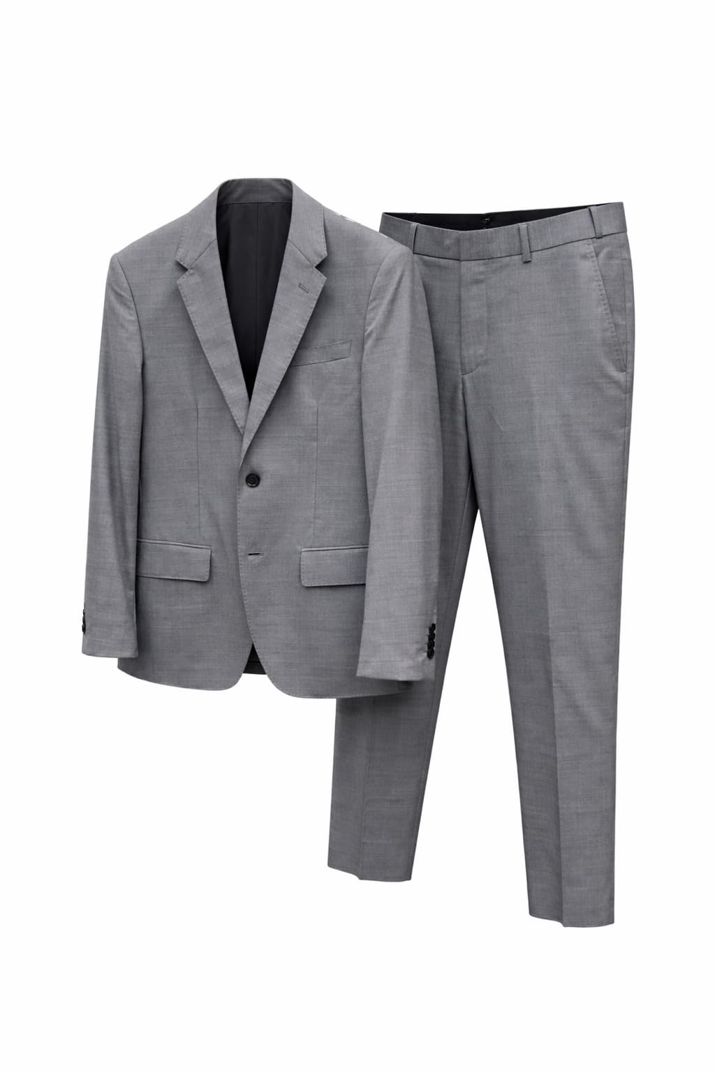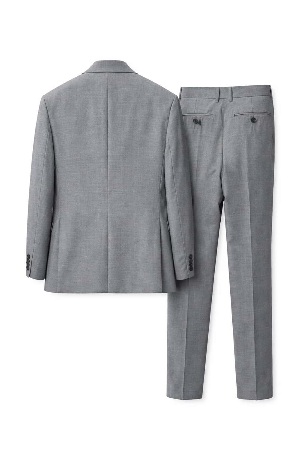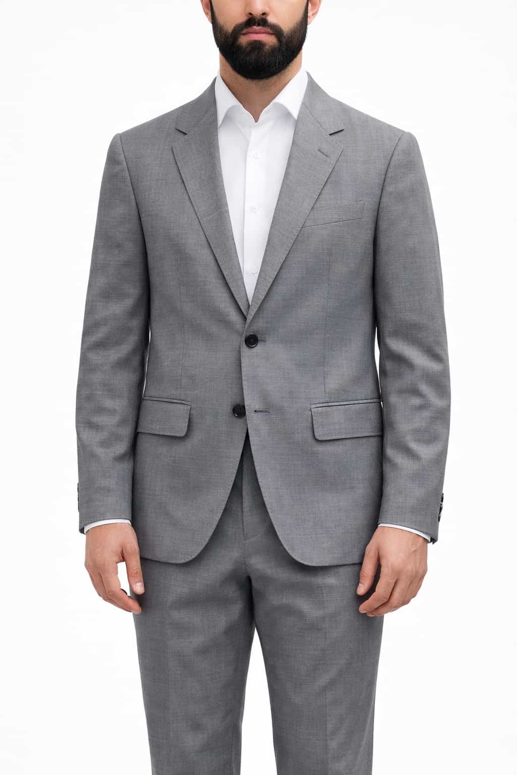 Цвет: серый. Комплект: пиджак + брюки. Крой: классический/прямой силуэт. Пиджак: однобортный, застёжка на 2 пуговицы, английские лацканы, нагрудный карман, карманы с клапанами. Брюки: классические, прямые, со шлёвками под ремень, боковые карманы. Сезонность: демисезон/круглый год (в зависимости от сочетаний). Стиль: business / formal / smart casual.