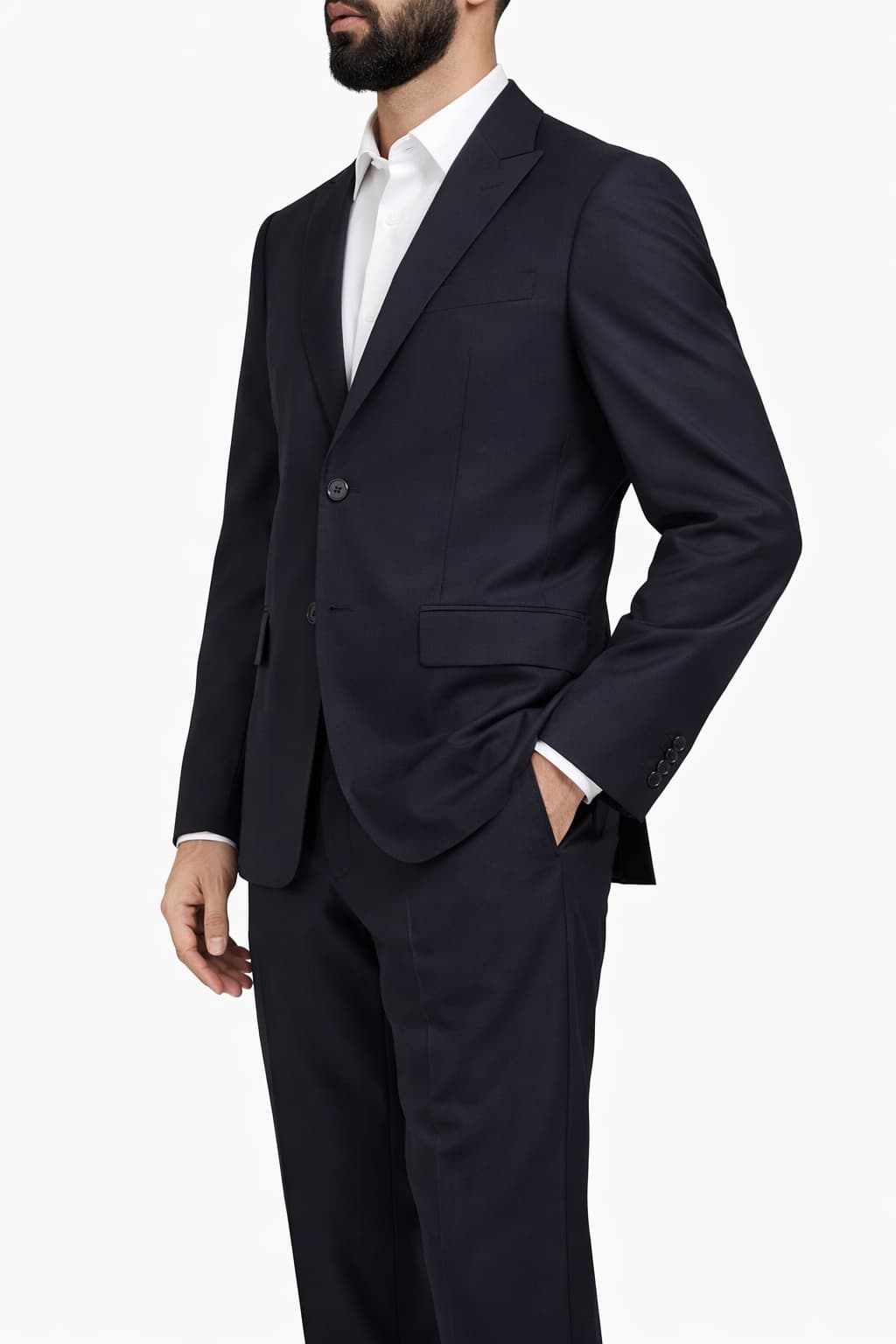 Пиджак отличается чистым, выверенным силуэтом с аккуратной линией плеч, благородными лацканами и идеальной посадкой, подчёркивающей фигуру без излишней жёсткости. Брюки дополняют образ строгими стрелками и продуманной конструкцией пояса, обеспечивая комфорт при движении и аккуратный вид в течение всего дня. Ткань костюма гладкая, плотная и эластичная, с матовой фактурой и ровным цветом, благодаря чему изделие выглядит дорого и презентабельно как при дневном, так и при вечернем освещении. Костюм одинаково уместен для деловых встреч, официальных мероприятий и торжественных случаев, легко сочетается с классическими рубашками, водолазками и кожаной обувью, формируя современный и статусный образ.