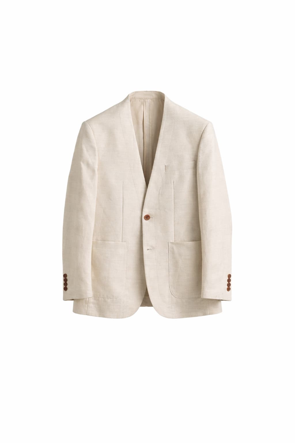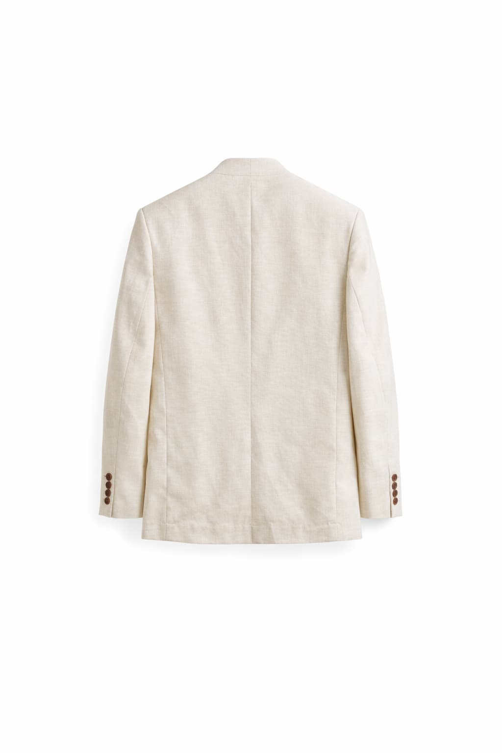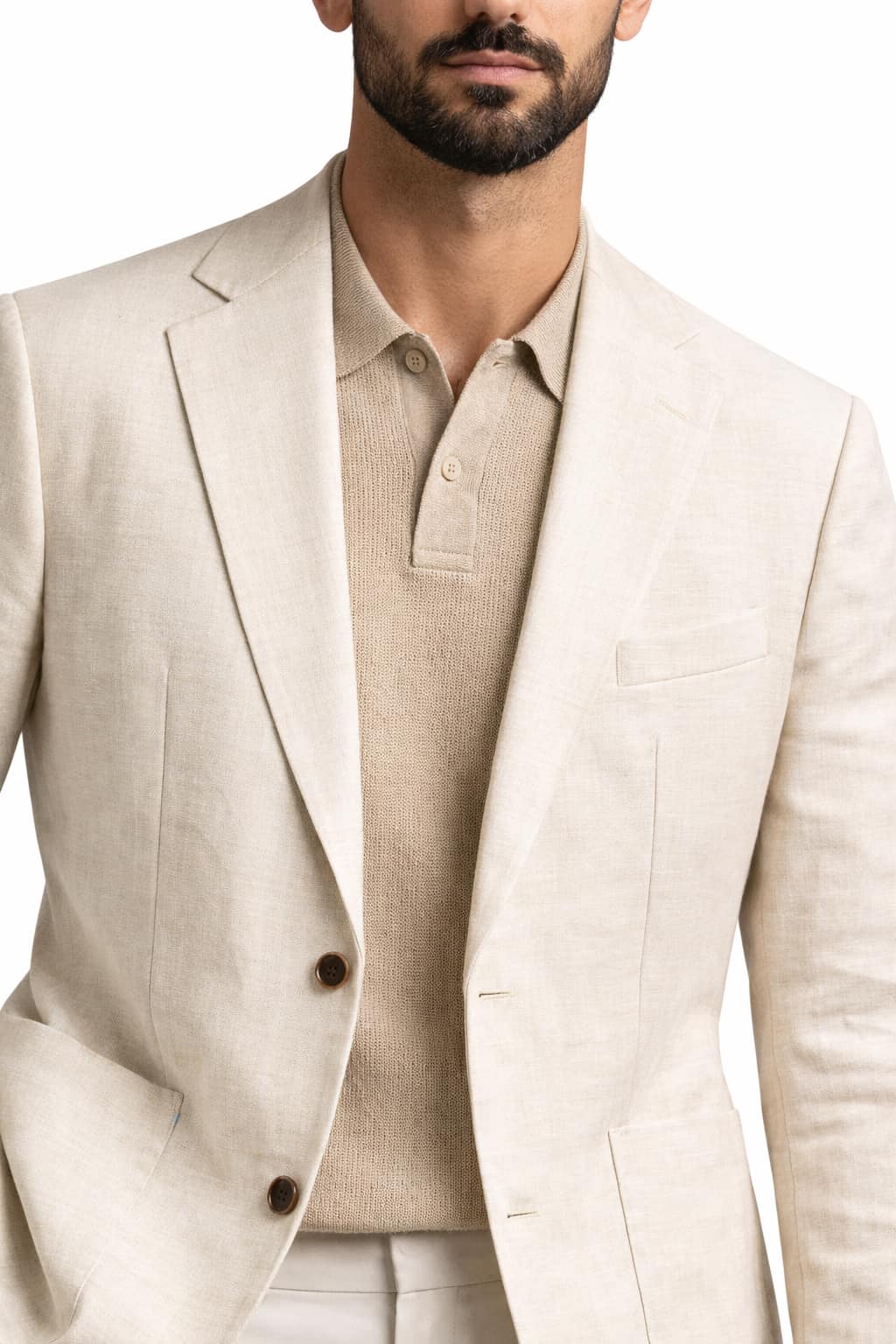 Костюм выполнен из натуральной льняной ткани с выразительной текстурой, которая обеспечивает отличную воздухопроницаемость и комфорт в течение всего дня. Пиджак имеет аккуратный воротник с мягкими лацканами, накладные карманы и застёжку на пуговицы из натурального материала. Посадка современная, без излишней жёсткости, благодаря чему изделие выглядит естественно и дорого. Внутренняя часть обработана аккуратно, с вниманием к деталям и качеству швов. Цвет — светлый натуральный, подчёркивающий фактуру льна и создающий ощущение чистоты и премиальности.
