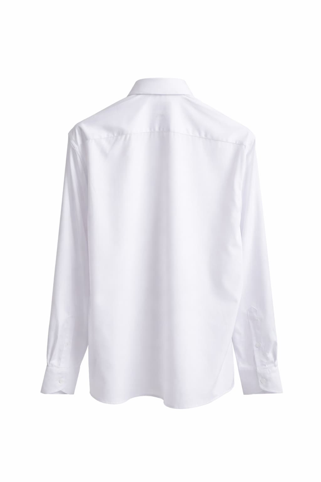 Рубашка выполнена из гладкой, плотной ткани с ровной текстурой, которая хорошо держит форму и выглядит аккуратно на протяжении всего дня. Материал приятен к телу, дышащий и комфортный в носке, благодаря чему изделие подходит как для офиса, так и для длительных мероприятий. Прямой крой средней посадки подчёркивает фигуру, не сковывая движений и сохраняя строгий, аккуратный силуэт. Классический воротник аккуратно лежит как с галстуком, так и без него, позволяя легко адаптировать рубашку под разные стили. Манжеты выполнены с чёткой линией и аккуратной строчкой, что подчёркивает общее качество пошива. Белый цвет выглядит чисто и благородно, легко сочетается с костюмами, брюками и джинсами, делая модель универсальным элементом мужского гардероба.