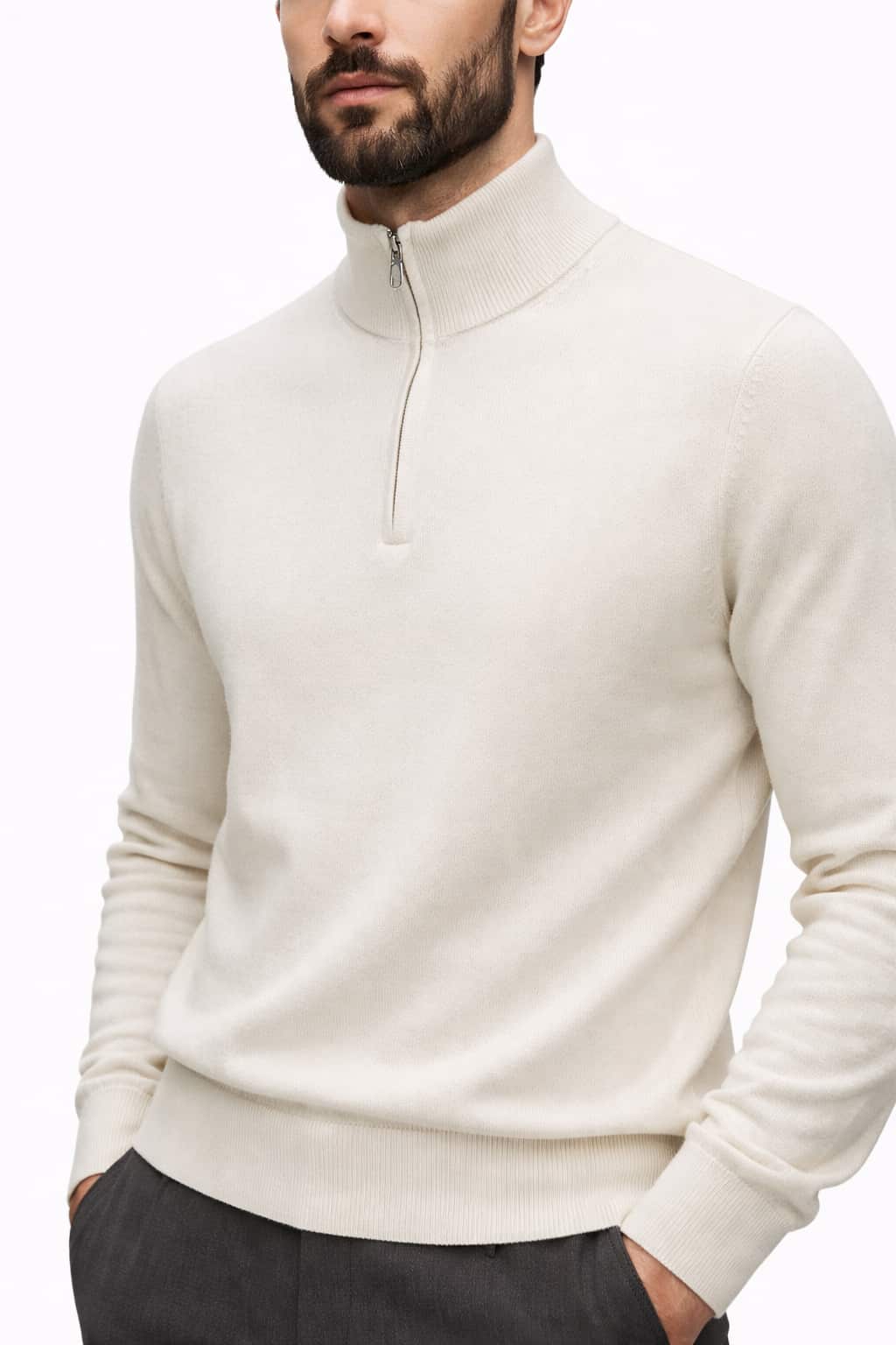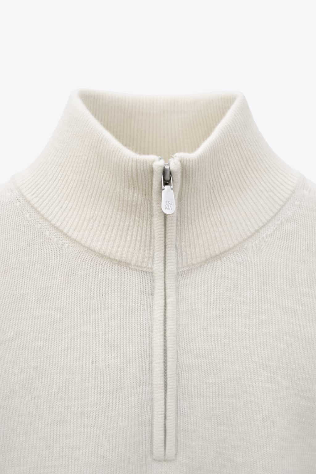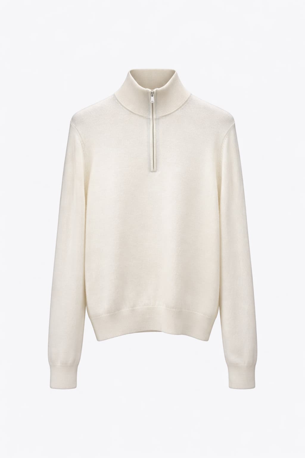 Свитер выполнен из мягкого и приятного к телу трикотажа с плотной структурой вязки. Модель имеет прямой современный крой, длинные рукава с эластичными манжетами и аккуратную нижнюю резинку. Воротник-стойка дополнен короткой металлической молнией, которая обеспечивает удобство и аккуратный внешний вид. Цвет изделия — молочный, нейтральный и легко сочетаемый с базовой палитрой гардероба.