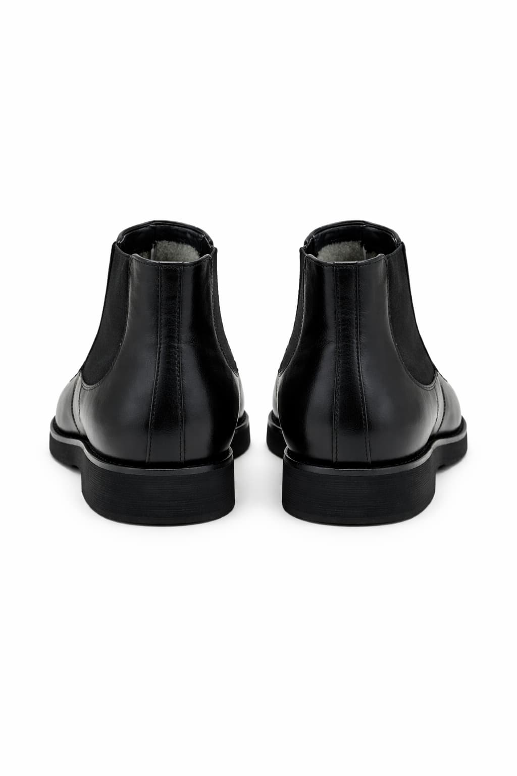 Модель выполнена из натуральной гладкой кожи чёрного цвета с эластичными боковыми вставками, обеспечивающими лёгкое надевание и плотную посадку по ноге. Внутренняя подкладка с мягким утеплением создаёт комфорт в прохладную погоду, не утяжеляя обувь. Подошва из износостойкого материала с устойчивым каблуком обеспечивает надёжное сцепление с поверхностью и хорошую амортизацию при ходьбе.